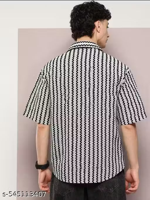 MEN'S CROCHET TREDNY COTTON HALF SLEEVE SHIRTS,Men Regular Fit Self Design Spread Collar Casual Black Shirt